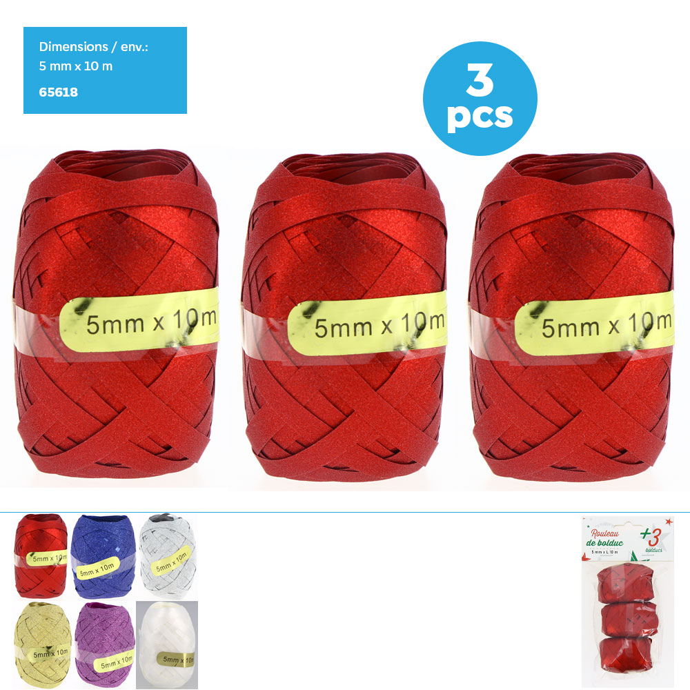 Sachet de 3 Bolducs 5mmx10M Paillettes Matière: PVC 6 couleurs: argent/ rouge/ or/ vert/ bleu/rouge/Rose Emballage: 5 pièces par polybag avec header card.